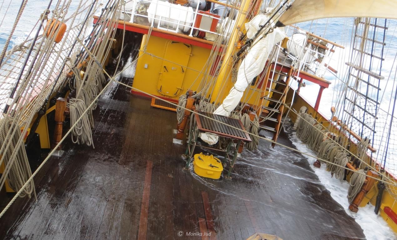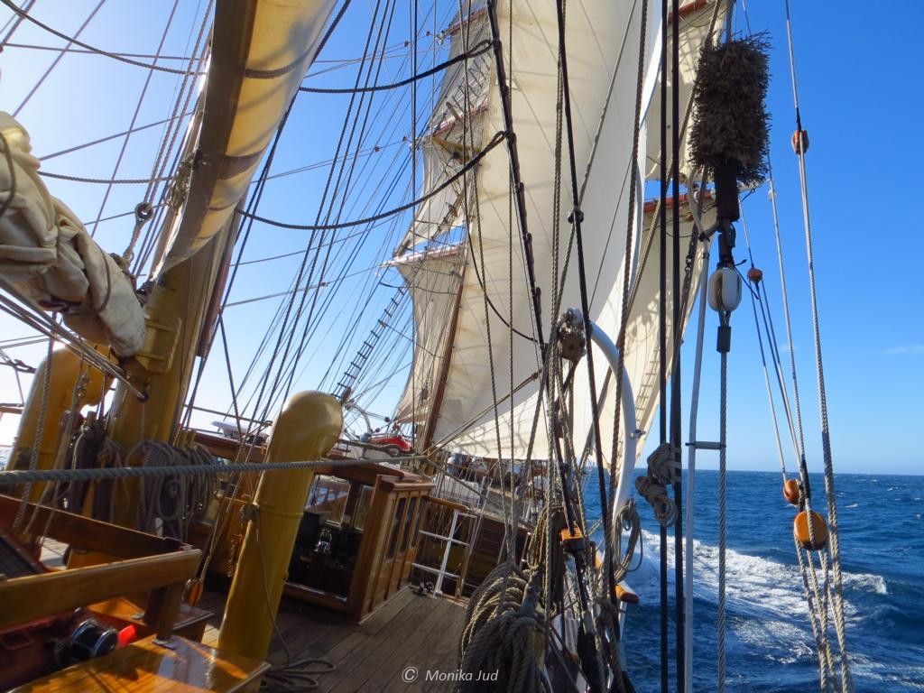 Mit jedem Tag wächst die Bewunderung für die feste Crew der Bark. Täglich mehr als 12 Stunden versehen sie bei Wind und Wetter ihren Dienst. Segel hissen, Eiswache im höchsten Mast, Schiffsreinigung, Essen kochen und und und. Häufig nur zwei oder vier, niemals mehr als sechs Stunden Schlaf am Stück.