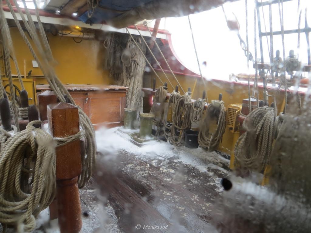 Das Wetter ändert in dieser Woche gern im Minutentakt. Kaum sind bei wenig Wind sämtliche Segel gesetzt, brechen plötzlich Hagel und Sturm hervor. In schwankenden Masten verpackt die Crew nasse, gefrorene Segel, die vor wenigen Minuten erst empor gezogen wurden.