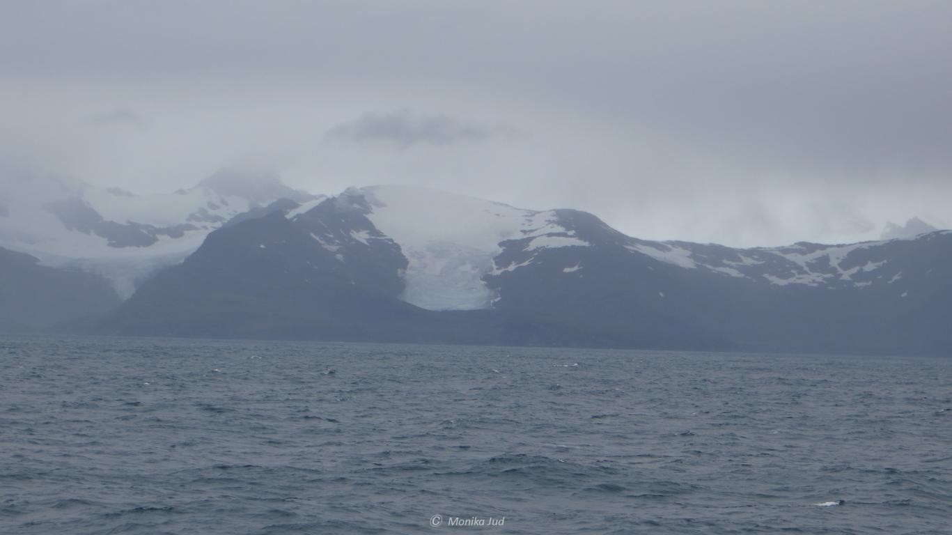 Es sieht aus, als hätte sich ein Bergtal an zu vielen regnerischen Tagen mit Wasser gefüllt. Bis zu 3 Kilometer hoch steigen die Berge fast direkt aus der See empor. Graue schroffe Felsen, die sich in einem ebenso grauen Himmel verlieren. Ein paar schmutzig weiße Gletscher suchen die Flucht in die offene See. Wo liegt die versprochene Schönheit, wo die Einzigartigkeit?