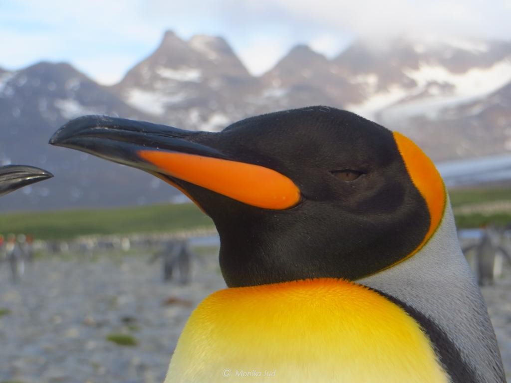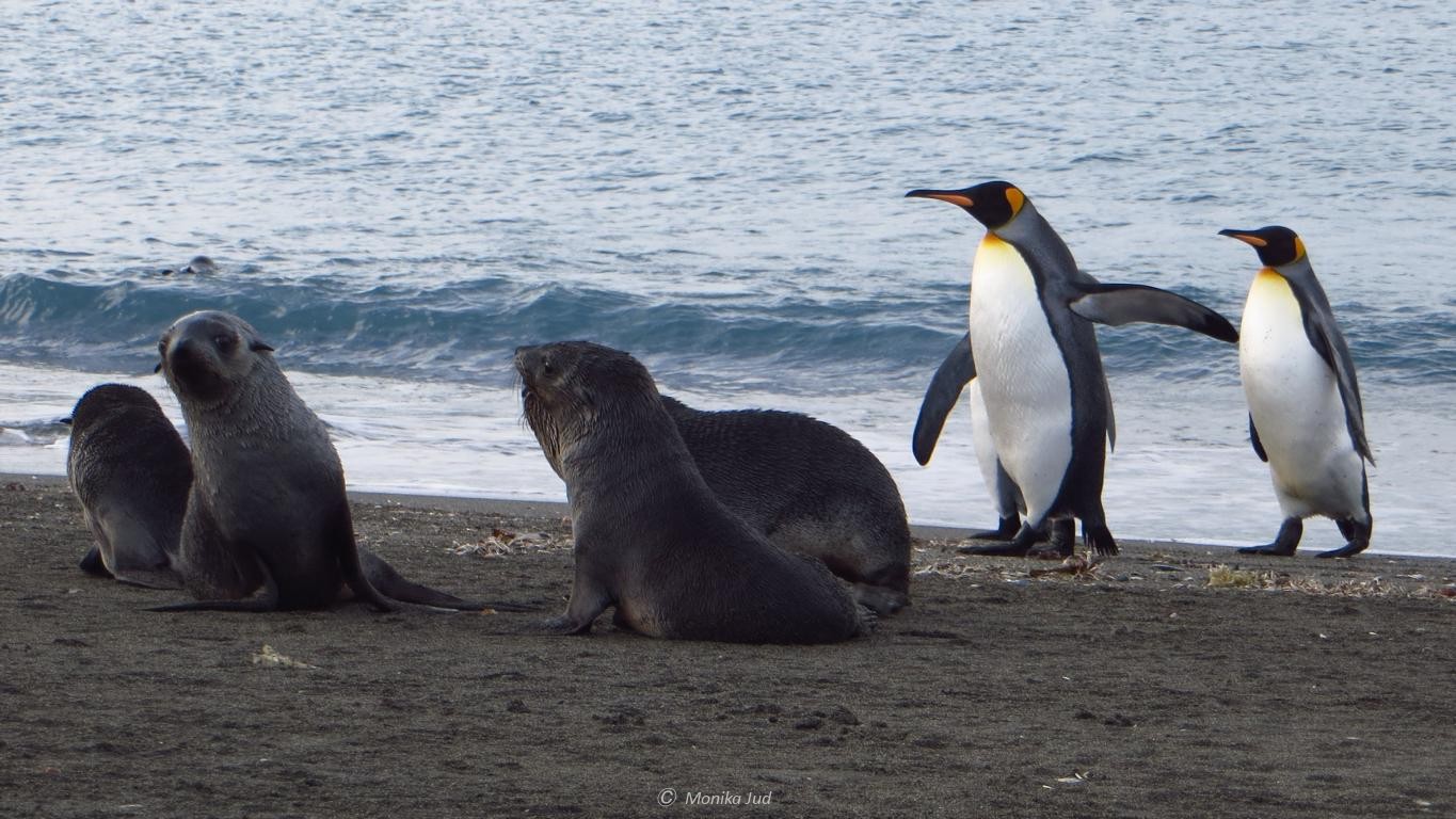 Und auch eine der größten Kolonien von Königs-Pinguinen bevölkert diesen Fleck. Majestätisch laufen sie uns mit ihrem leuchtend goldenem Hals und fast hüfthoch entgegen. Sie picken hier und da nach Kleidung oder Gummistiefeln und keine Scheu zeigt sich in den Augen.