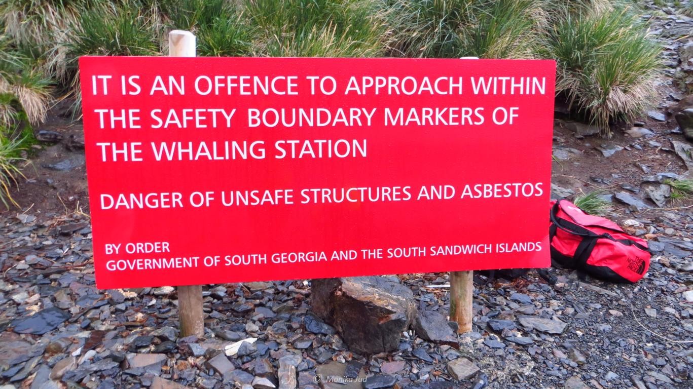 Aber der Ort ist verlassen und wirkt gespenstisch. Das Heulen hunderter Pelzrobben hallt von den steilen Wänden der Bucht zurück. Rote Schilder aus jüngeren Tagen verbieten den Zutritt in die alte Station. Die Schilder warnen vor losen Blechen und staubendem Asbest.