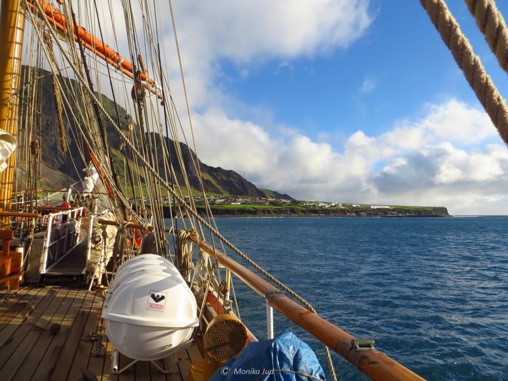 Eines nach dem anderen werden in der Dunkelheit die Segel eingeholt, bis schließlich um 4 Uhr in der Frühe die Ankerkette nur knapp vor der Insel scheppernd ins Wasser fällt und das Segelschiff an den Boden klebt. Es ist wolkig und regnerisch, noch lässt sich außer den Lichtern nichts von der Insel erkennen.