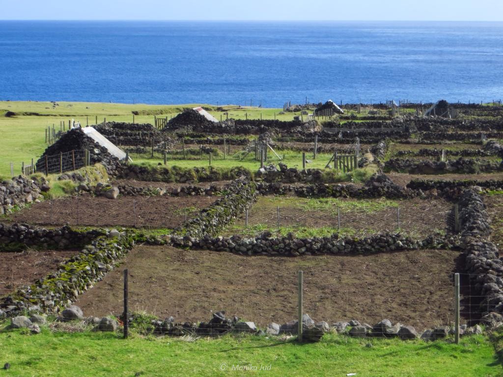 Ein Stück vom Dorf entfernt liegen ein paar große Kartoffelfelder, die sich mit flachen Mauern aus schwarzem Vulkanstein in kleine Parzellen unterteilen. Vermutlich wurden diese Felder über Generationen geteilt und vererbt und wieder geteilt und wieder vererbt.